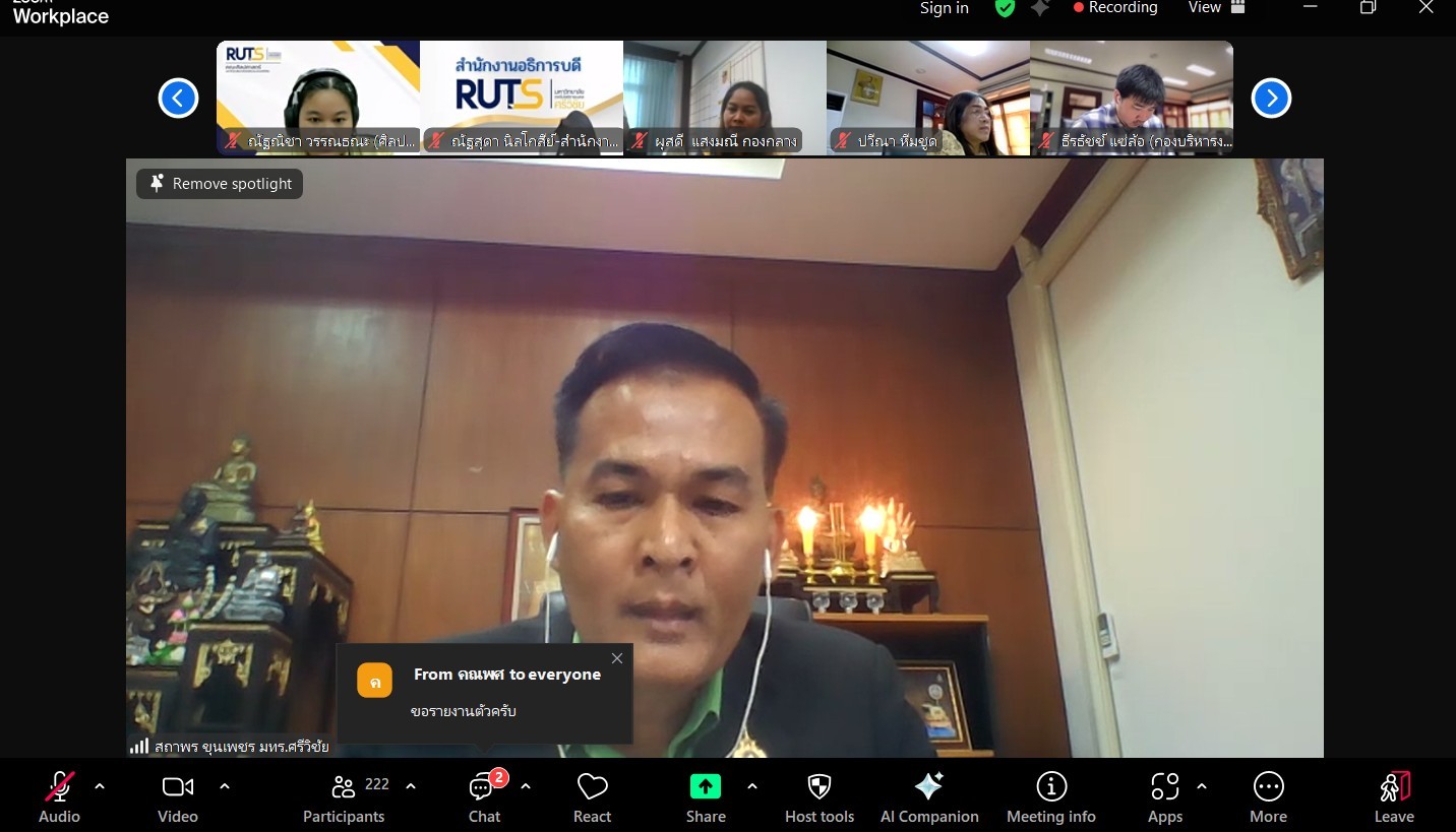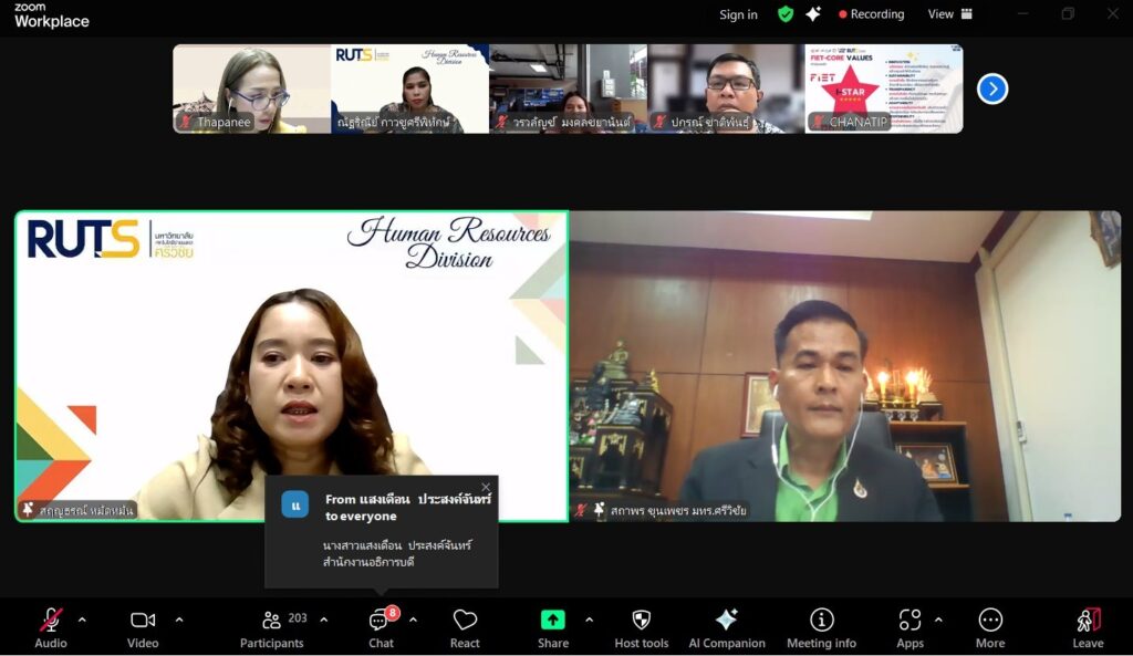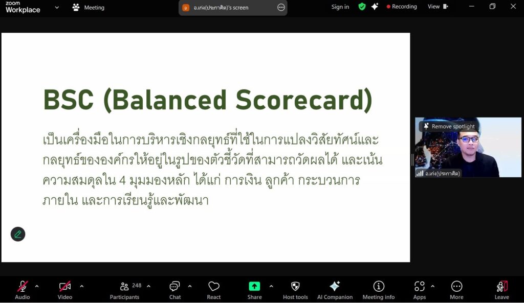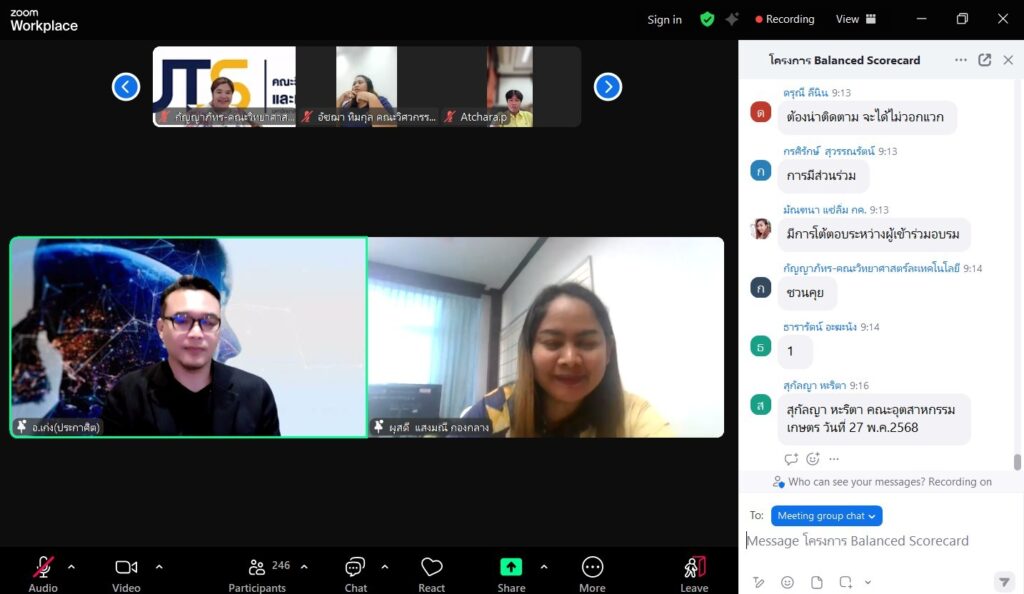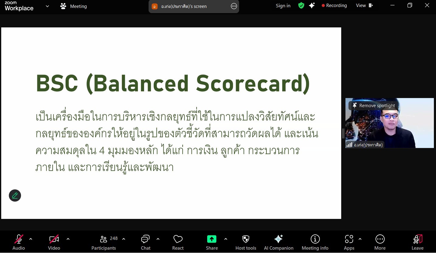 โครงการอบรมเชิงปฏิบัติการ เรื่อง พัฒนาทักษะการปฏิบัติงานด้วย Balanced Scorecard ในระหว่างวันที่ 26-27 พฤษภาคม 2568 ผ่านระบบ Zoom Cloud Meeting เพื่อให้บุคลากรนำแนวคิดและหลักการของ Balanced Scorecard มาปรับใช้ในการปฏิบัติงานให้เกิดประสิทธิภาพ โดยมีอาจารย์ประกาศิต สพฤกษ์ศรี มาเป็นวิทยากรบรรยายในครั้งนี้ โดยได้รับเกียรติจากท่านอาจารย์สถาพร ขุนเพชร รองอธิการบดี เป็นประธานในการกล่าวเปิดโครงการ